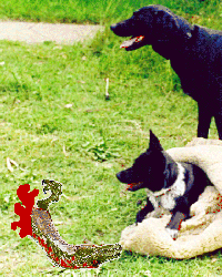The funny thing is that this type of behaviour is gradually edging into most of his homework. (He has actually changed his motto from "To succeed with no effort" to "Sufficient is nowhere near enough".) Just last week we had another spitting/hissing possum in the backyard (which Ellie and I consequently bailed up in a 100 foot gumtree). The normal Master would probably just turn on an outside light, make a bit of noise and hope that the thing would go away. Well, not Master Craig - let's talk 500 Watt spotlights, 100 watt globes at the ends of extension cords, complicated possum disruptors and the like. It was that bright that when the lights went off (at Mistress Liz's demand), Ellie and I both managed to walk into a few trees before just deciding to sit and wait out our night-blindness. He never got the possum, though.